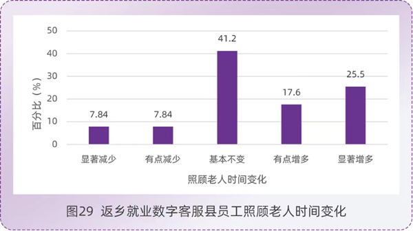 上班就在家门口,也有助于照顾父母、养育子女,增强和家庭的联结,促进家庭和睦,“留守子女”、“空巢老人”等现象的缓解。在调查中发现,数字客服近四分之三的从业者为女性员工,歇业再就业和首次就业的员工占比29.5%。在女性未就业的原因中,怀孕或哺乳、料理家务或带孩子、照顾家人等家庭因素的占比超过50%。