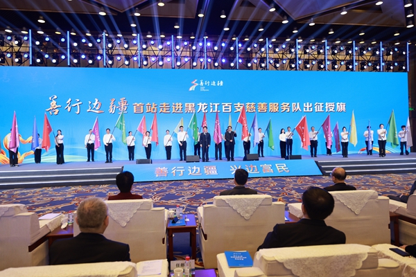 中国慈善联合会会长张春生为即将奔赴各地服务的“善行边疆”首站黑龙江百支慈善服务队授旗